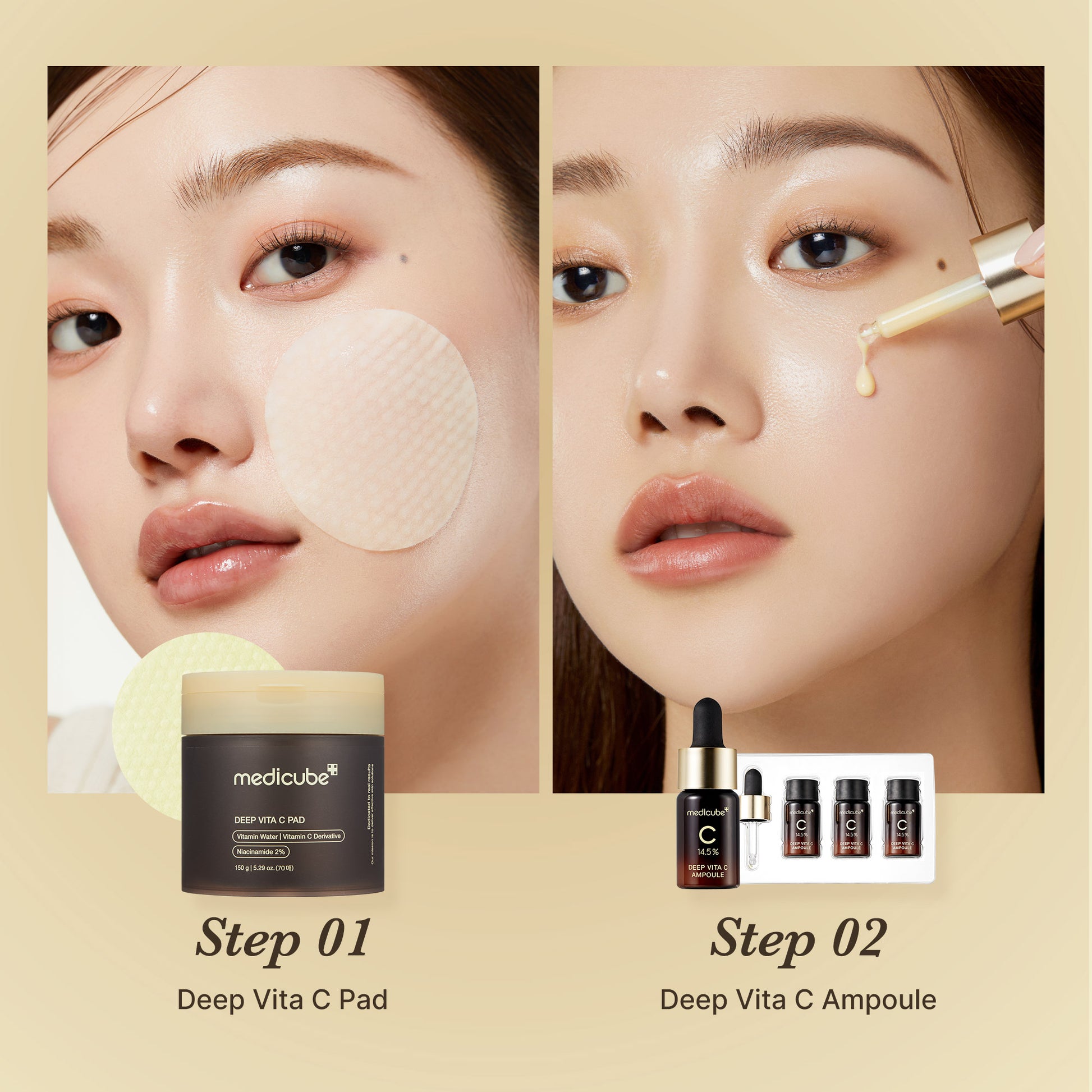 • 1. Gently swipe the Deep Vita C Pad across your cleansed face and neck. Each pad is infused with Vitamin C brilliance to revitalize and nourish your skin. Discard after use for a fresh experience each time.